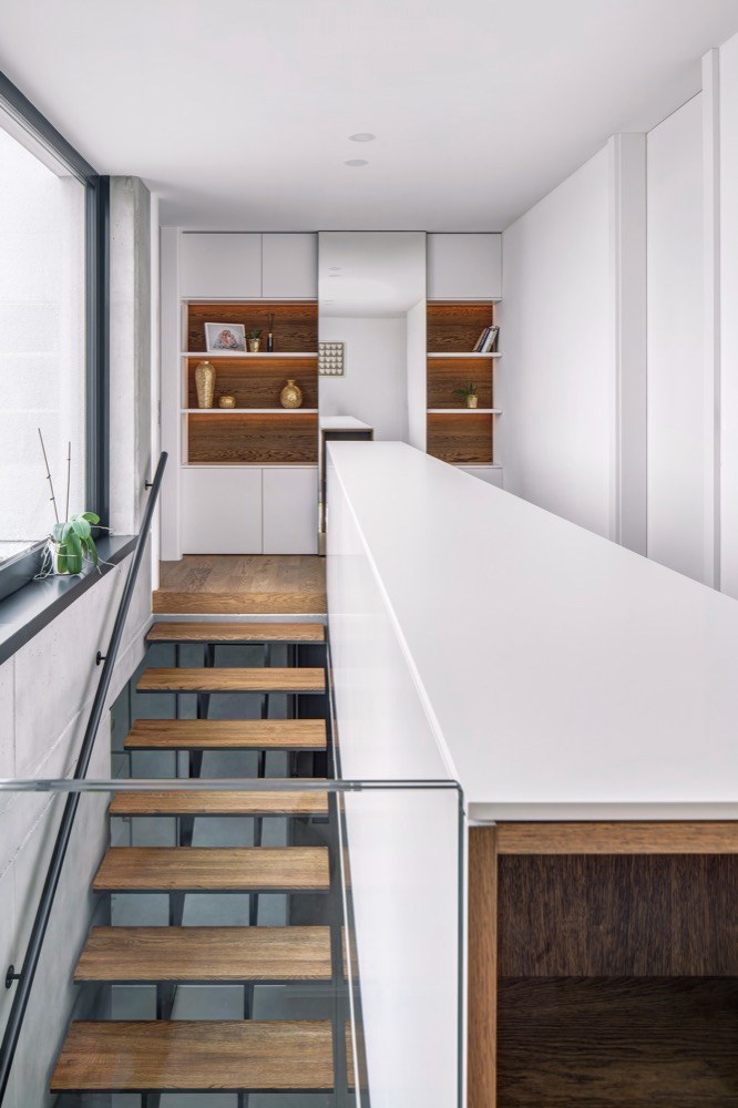 Třetí podlaží domu je čistě soukromé. Tvoří ho hlavní ložnice s šatnou a koupelnou, dva dětské pokoje a dětská koupelna. Intimní podlaží je s prostředním propojeno ocelovým schodištěm s dubovými nášlapy. Zábradlí schodiště nejvyššího patra tvoří dlouhá komoda, která nabízí úložný prostor například pro lůžkoviny, ručníky či cokoliv, co nechcete mít v šatně s oblečením. V chodbě našla mimo jiné místo i knihovna s posuvným zrcadlovým panelem. Koupelnám bylo věnováno dostatek prostoru i hodně pozornosti, v obou lze využívat vanu i sprchový kout. Shoz prádla je přístupný také z obou koupelen, v koupelně rodičů je rafinovaně skryt za zrcadlovými dvířky úložné skříňky nad umyvadly.