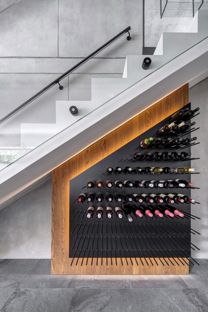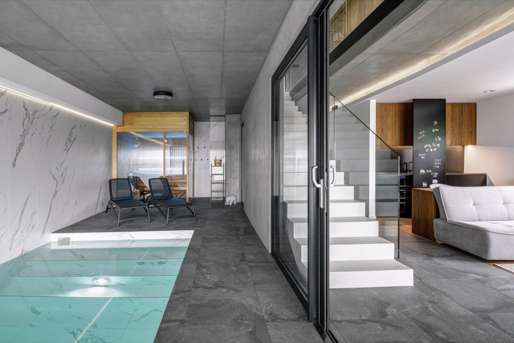 Spodní patro je přímo propojeno se zahradou a zahrnuje wellness s bazénem a saunou, hernu s menší kuchyní i technické zázemí domu s prádelnou. Multifunkční místnost herny ukrývá nevšední ocelovou vinotéku, která je vetknuta do jinak méně využitelného místa pod schodištěm. Kuchyň je částečně kryta magnetickým posuvným panelem. Bazén není řešený jako nerezová či jakákoliv jiná vana, ale je obložený dlaždicemi, které se objevují i v dalších koupelnách domu.