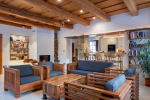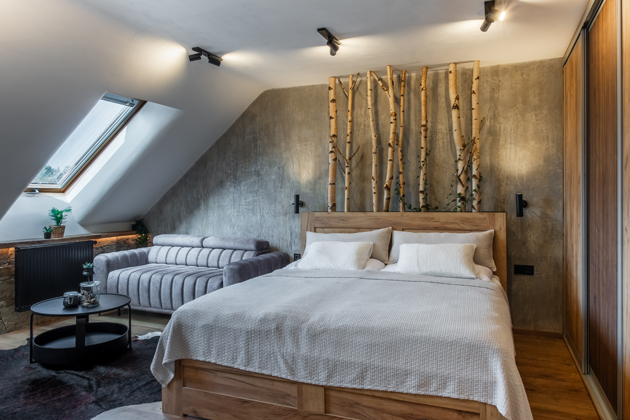 Interiér propojuje architekturu a přírodou, celý dům prolínají přírodní barvy i materiály. Dřevo bylo použito v podobě ručně tesaných, překládaných trámových stropů i v přírodní formě neopracovaných kmenů. „Jako propojující prvek mezi interiérem a exteriérem jsme na schodišti zvolili březové kmeny. Majitel se jimi natolik nadchnul, že jsme je zakomponovali i do dalších místností.,“ popisuje Ing. arch. Filip Ciahotný. Přírodní podoba dřeva ale svoji podstatnou roli hraje také na nábytkovém vybavení, které do interiéru dodávala místní firma Valoverda Friends, zaměřující se na designový nábytek.