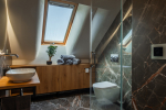Druhým významným materiálem se stal kámen, s jehož opracováním má majitel stavby zkušenosti ze profesní praxe. „Při rekonstrukci jsme se snažili používat materiál z daného místa a lokality. Kámen tak pochází zčásti z našich pozemků, ale i z vrcholu Pusteven. Parapety, jimiž jsou ukončeny kamenné obvodové zídky pokojů v patře, jsou z podlah přilehlé stodoly, na kterých se v minulosti ručně mlátilo cepy obilí,“ dodává Radim Kovář, který se se svojí stavební firmou MRK STAVBY ujal praktické části rekonstrukce. Kameny byly použité i pro čtecí kout v obývacím pokoji s knihovnou a krbem Hoxter, který realizovala firma Krby Hlučín.