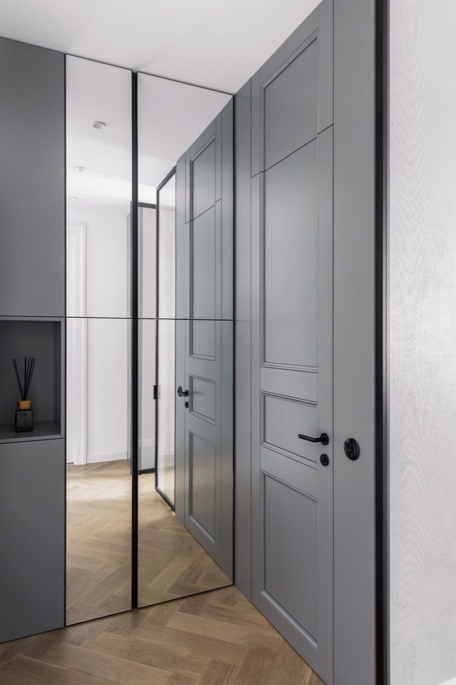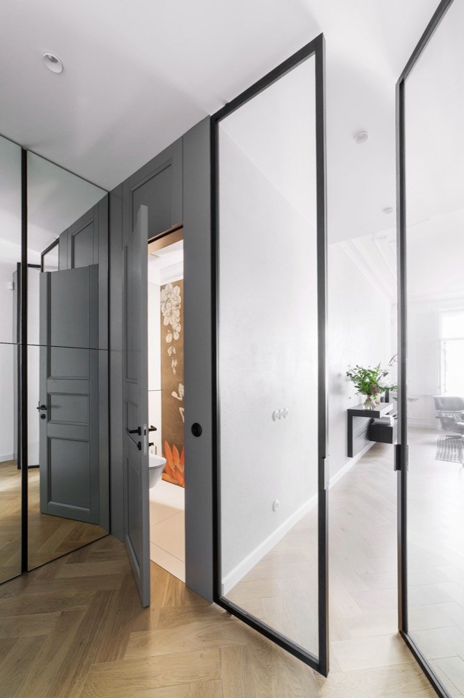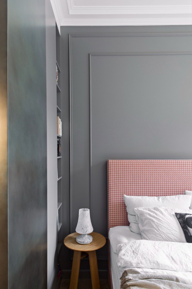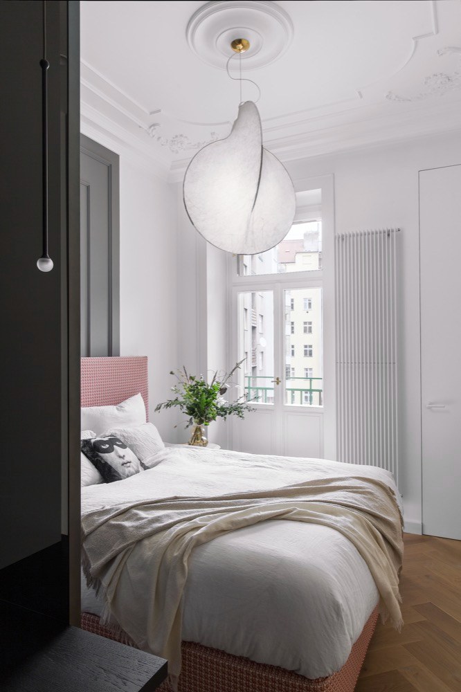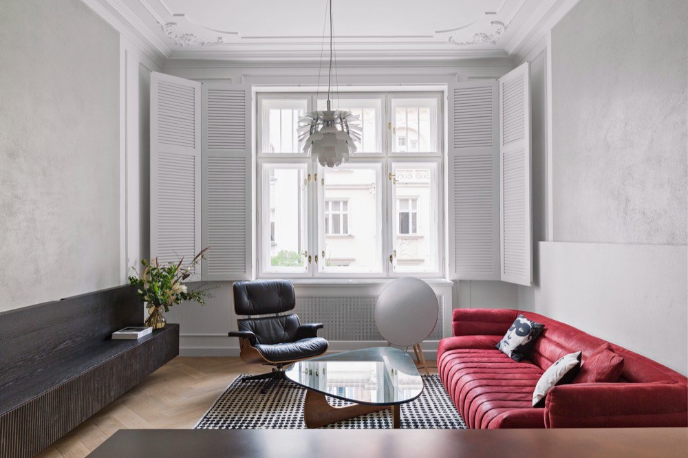 Inspirace pražskými Vinohrady byla určitě základním motivem, jen jsme byt chtěli posunout trochu dál. Vycházeli jsme z původních dřevěných podlah, ale zvolili jsme větší rozměr jednotlivých parket. Dveře do jednotlivých pokojů jsme ponechali profilované, ale udělali jsme je vyšší a v případě toalety pak součástí obložení stěny a doplnili je moderními klikami. Sádrové štuky jsme použili jen v určitých výsecích a dále je nahradili dekorativní stěrkou nebo podsvícenou deskou apod.