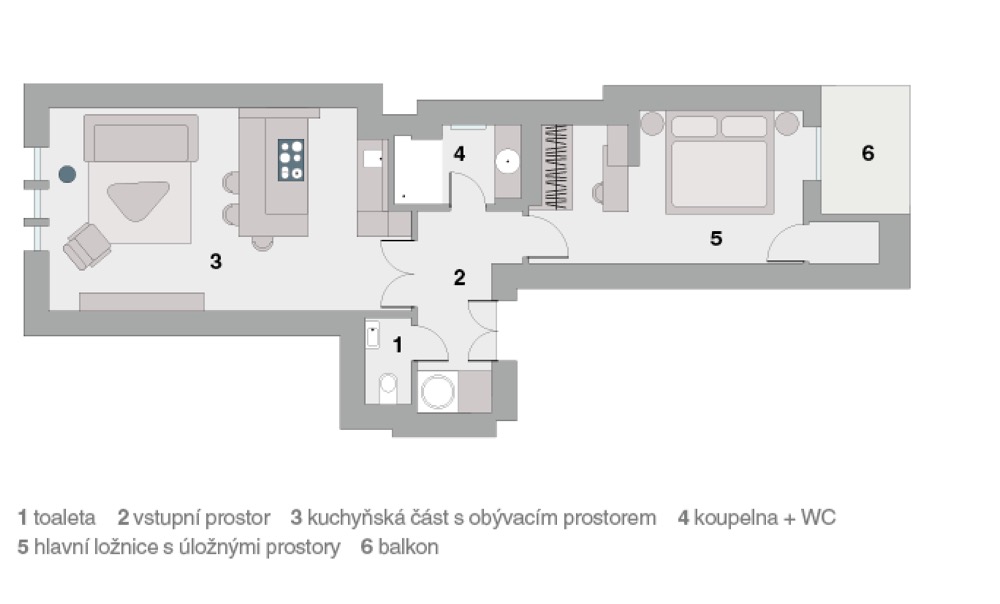 Byt jsme převzali ve stavu shell and core, tedy bez jakýchkoli povrchů a rozvodů. Vzhledem k tomu, že se jedná o byt 2+kk, dispoziční úpravy byly minimální, a to pouze v centrální části bytu, kde byl požadavek klienta na samostatné WC a koupelnu zvlášť. Protože byt není moc velký, museli jsme se poprat hlavně s úložnými prostory. Většina skříní je tedy vestavná, abychom maximálně využili každého dostupného místa.