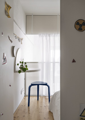 Dětský pokoj je řešen jako víceúrovňový celek. Spací kouty dvou sester se nacházejí ve zvýšeném patře, zatímco spodní úroveň slouží jako společná zóna pro učení, hraní i odpočinek. Ložnice pak ukrývá další domácí pracovnu, nenápadně integrovanou tak, aby zůstala zachována klidná atmosféra místnosti. Interiér bytu v projektu Parvi Cibulka tak citlivě propojuje industriální architekturu s funkčností a osobním výrazem. Výsledkem je bydlení, jež respektuje charakter místa a zároveň nabízí komfort, variabilitu a překvapení v každém detailu.