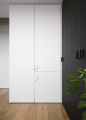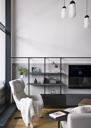 Typickým rysem bytu je práce s vertikalitou. Každý pokoj disponuje vlastním zvýšeným patrem, vybudovaným developerem, které rozšiřuje užitnou plochu a zároveň přináší do interiéru hravost. Nad obývacím pokojem vznikla pracovna s chill zónou pro večerní relax, jež využívá výšku prostoru bez narušení jeho otevřenosti.