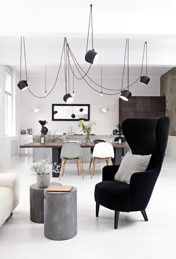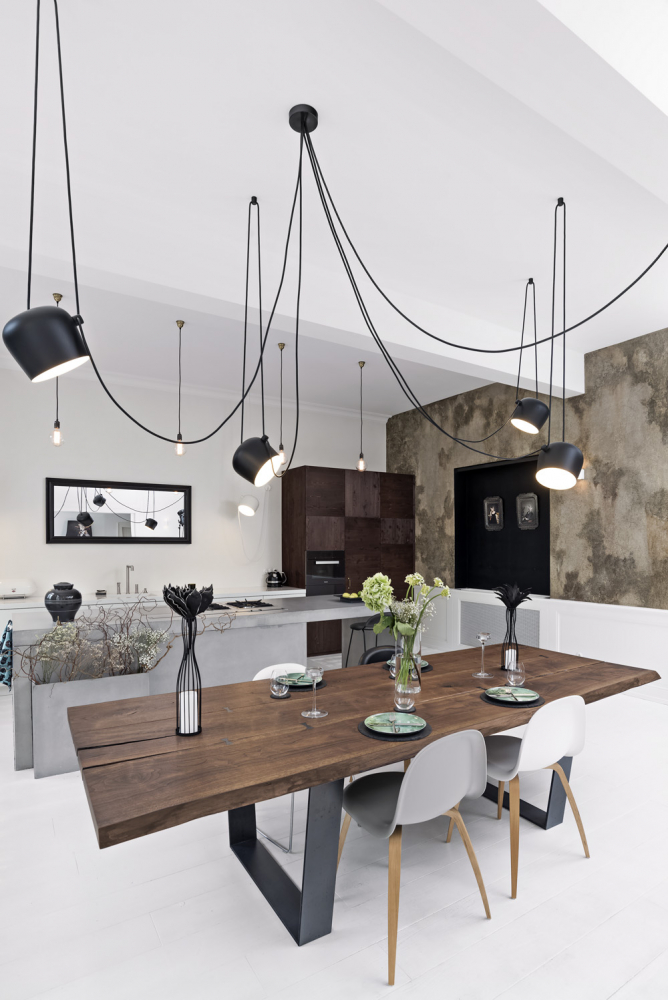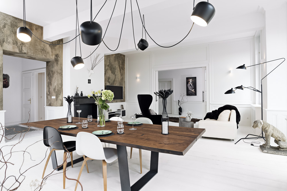 Atypicky nad touto nízkou částí nábytku nejsou umístěny horní skříňky, ale zrcadlo, které prostor opticky prodlužuje. Skříň s vestavnými spotřebiči navozuje dojem almary. Jídelní stůl, úctyhodných rozměrů 3,1 x 1,1 m, tvoří dominantu celého obytného pokoje. Jeho rozměry výhledově slibují pohodlí až deseti osobám. Rozměrné svítidlo s pěti světelnými zdroji a soustavou kabelů připomíná liány. Umožňuje vysokou variabilitu směrování toku světla.