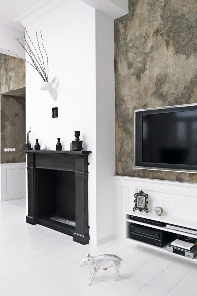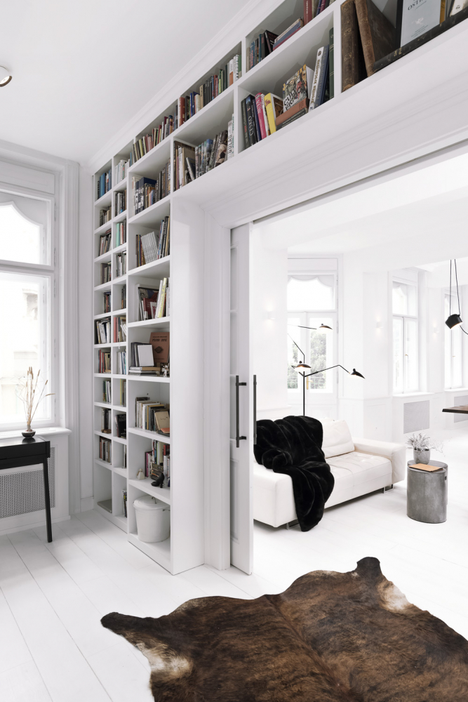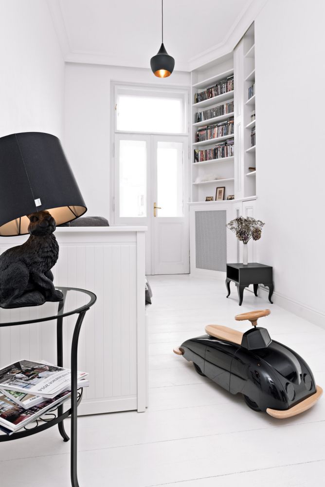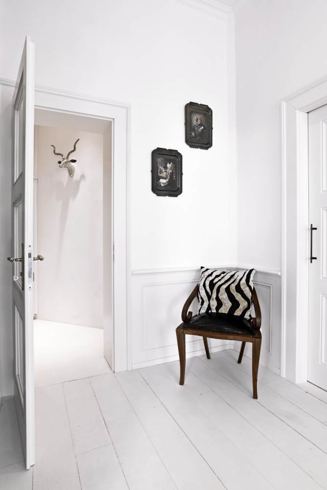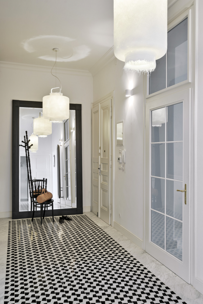 Rekonstrukcí došlo ke spojení obou bytů. Přestože se v bytě moc původních prvků nedochovalo, architektky se rozhodly většinu stavebních detailů obnovit a doplnit. Celý interiér vyznívá velmi světle. Oděly ho do bílé barvy včetně masivní prkenné podlahy. V obývacím pokoji a ve vstupní hale tvoří kontrastní plochu výrazná malba stěny.