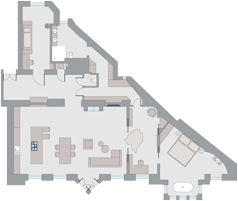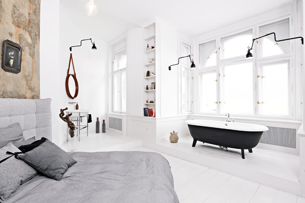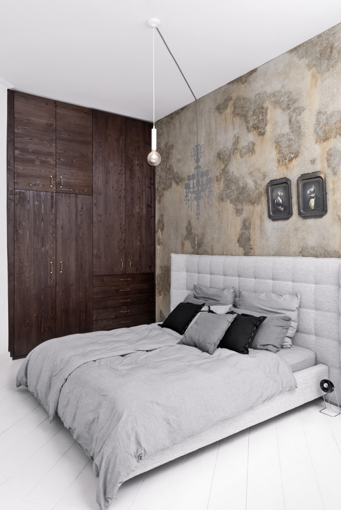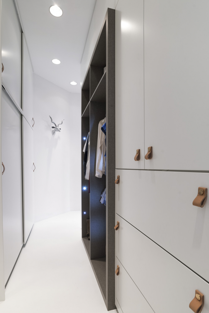 Celá tato stěna je osazena velkou knihovnou a pod oknem je umístěn malý sklápěcí konzolový stolek. Z pracovny je přístupná šatna a zázemí bytu a stejně tak i hlavní ložnice situovaná do trojúhelníkového cípu bytu. Oblá nika posloužila umyvadlu a arkýř zase volně stojící vaně. Nad postelí je osazeno stropní svítidlo tvořené osamocenou žárovkou s mimořádně efektním „stínem“ křišťálového lustru na zdi. V koupelně s přístupem denního světla vznikl velký walk-in sprchový kout s kouřovým sklem a na něj navazující pult s umyvadly.
