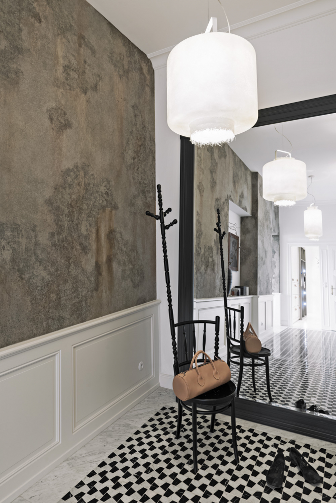 „Původním záměrem byla oškrábaná omítka, které však nebylo možné kvůli novým rozvodům elektroinstalace dosáhnout. Nicméně myšlenku ‚plesnivé zdi‘ jsme neopustily. Po několika desítkách vzorků zvítězila malba kulis. Materiály jednotlivých solitérů jsme volily v kontrastu s bílým základem,“ popisuje Radka Valová. Stěny jsou doplněny kazetovým obložením, které pod okny kryje radiátory. Stropy zkrásněly profilovanými rohovými lištami.