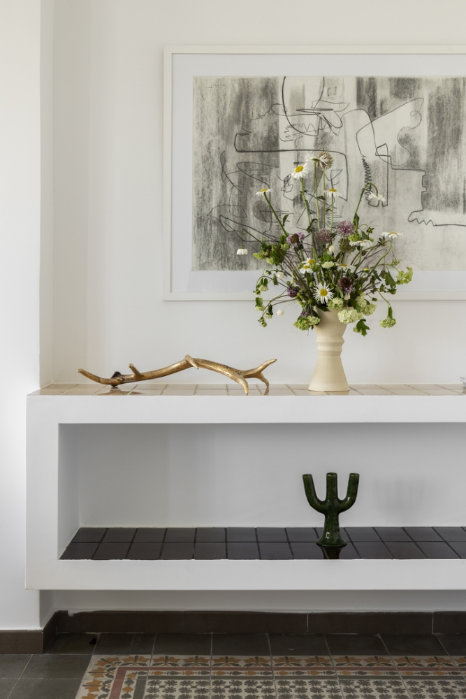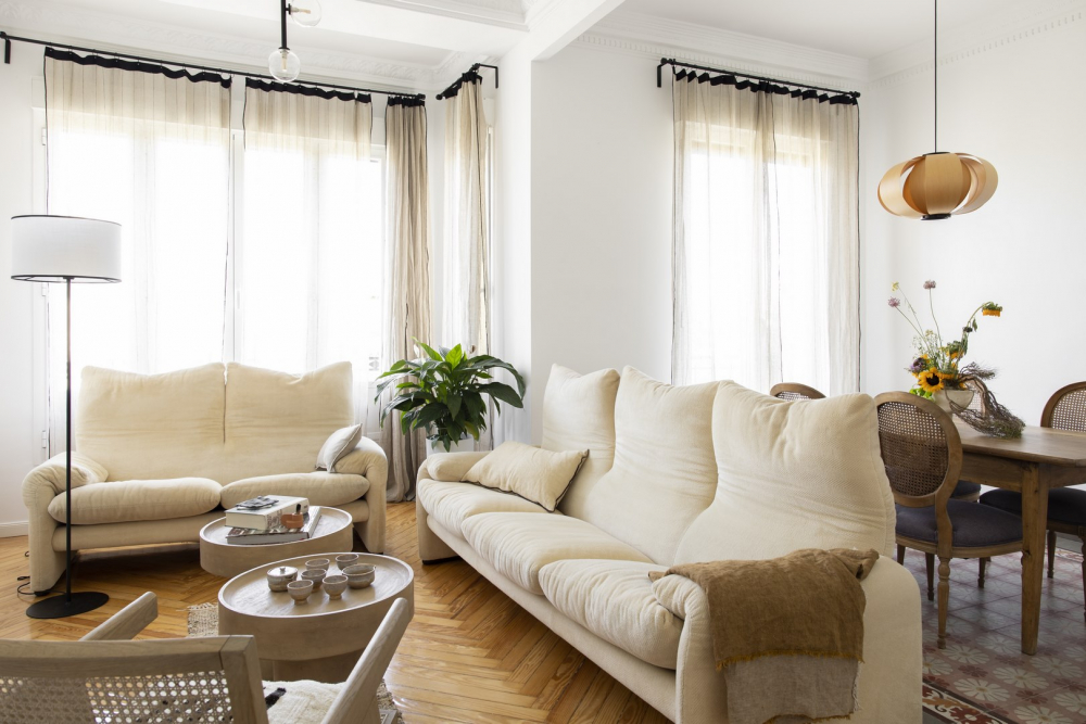 Bylo to komplikované, protože je to velmi velký obývací pokoj se třemi velmi dobře definovanými oblastmi, které je obtížné integrovat. Nakonec jsme se rozhodli vytvořit tři zóny: jednu pro pohovky, druhou pro jídelní stůl a třetí pro polici, která slouží jako dekorace a prostor pro květiny, keramiku a další předměty, které používáme každý den.