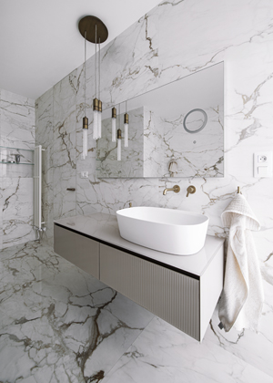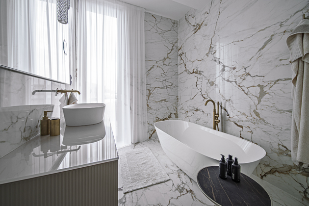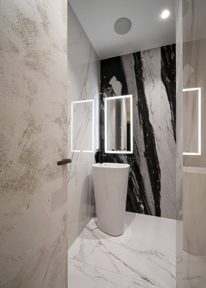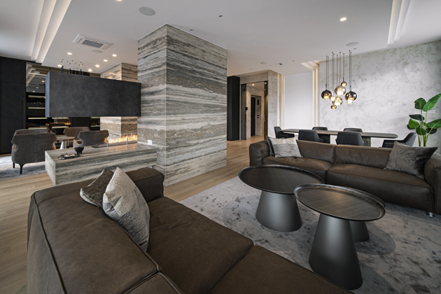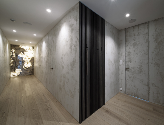Ve společných prostorách pak můžeme vidět kombinaci béžově šedé epoxidové stěrky, tmavého travertinu a diagonálně sesazené dubové dýhy mořené do tabákově hnědošedého odstínu. To vše v kontrastu se zářivým křemencem neboli quarzitem Taj Mahal a nábytkovými moduly v laku s efektem kotoučem zbroušené oxidované oceli. V celém interiéru je zajímavě použita kombinace stěrky, kamene, skla, kovu a dřeva tak, aby ve výsledku vznikl neotřelý a nápaditý interiér, který ale bude současně velmi nadčasový a snadno udržovatelný.