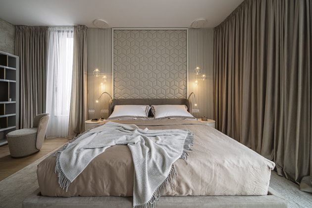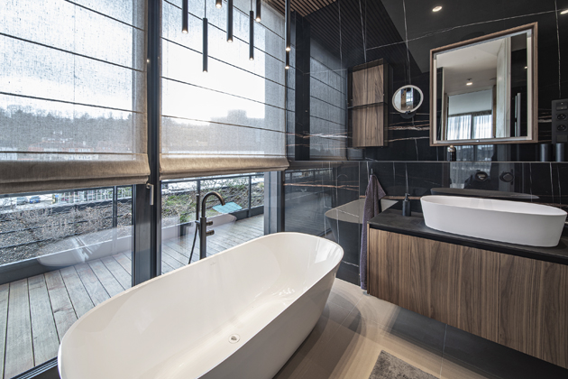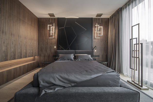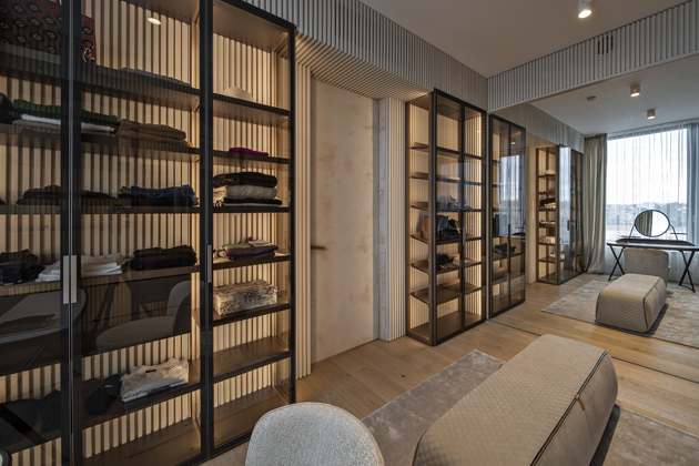 Přáním investora bylo mimo jiné také vytvořit dva pomyslně oddělené světy – pánskou část s pracovnou, šatnou, ložnicí a koupelnou a část určenou dámě, která bude disponovat stejnými místnostmi kromě pracovny. Designéři po několika sezeních s investorem dospěli k řešení tohoto záludného požadavku. Odlišení dosáhli díky jednoznačnému materiálovému a barevnému provedení.