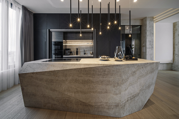 Ten vyžadoval laserem řezanou ocelovou konstrukci, na kterou bylo nutné na milimetr přesně dosadit velké desky kamene – celý ostrov má hmotnost přes půl tuny. V interiéru bylo celkově použito hned několik druhů přírodních kamenů. Ty byly pečlivě vybrány s kameníkem z množství kamenných bloků dostupných v lomu v Itálii. Bylo nutné vybrat takové desky, které by spolu kresbou a barvou – i přes svou velkou rozdílnost danou různými druhy kamenů – ideálně ladily.