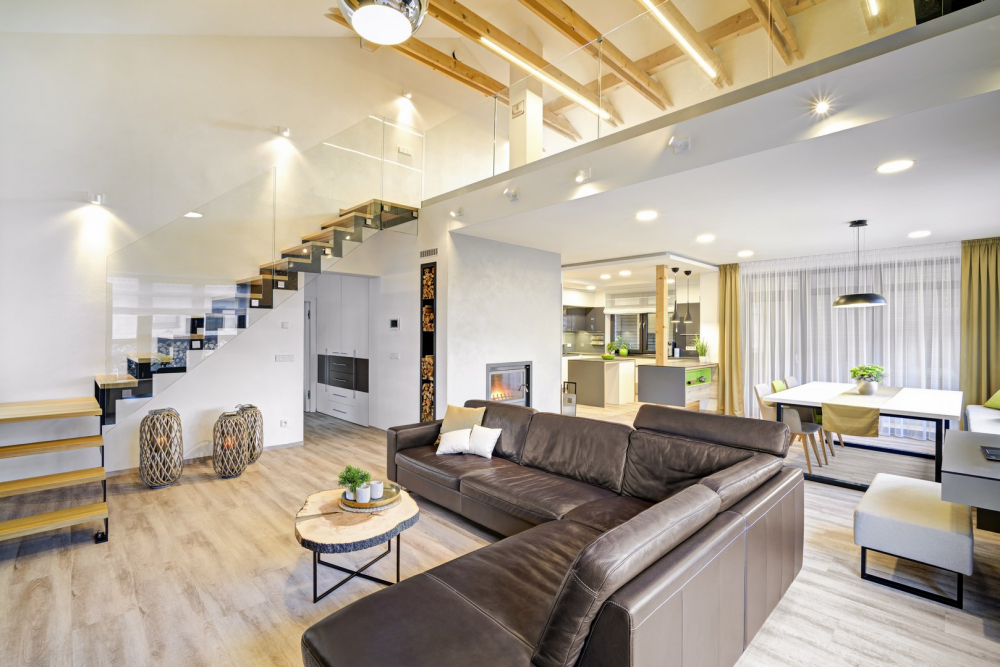 Rodina měla celkově velmi dobře promyšlenou dispozici domu. V denní části, tedy obývacím pokoji s jídelnou a vzdušnou galerií, chtěla vybudovat otevřený prostor propojený s dostatečně velkou kuchyní a větším jídelním stolem pro setkávání s širší rodinou a přáteli.