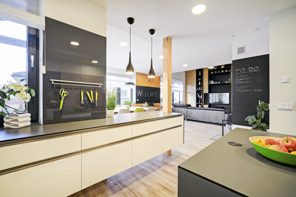Celá denní část je navržena v kombinaci dubová dýha - kompaktní pracovní deska v černém matném provedení, která se použila v kuchyni, jídelně i v pracovním koutě a na nábytku, a to včetně popisovatelných magnetických tabulí. Ty propojují doslova celý dům. Zatímco v kuchyni slouží hlavně k zápisu chybějících potravin a informací týkajících se kuchyně, tabule vedle jídelny je spíš organizační a vzpomínková. A dokonale tabule plní svůj účel také v dětských pokojích. S galerií je denní část propojena vzdušným schodištěm s masivními dubovými nášlapy a skleněným zábradlím. Jedním z hlavních kritérií byly také úložné prostory v kuchyni, využil se doslova každý kousek prostoru.