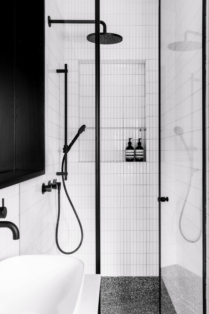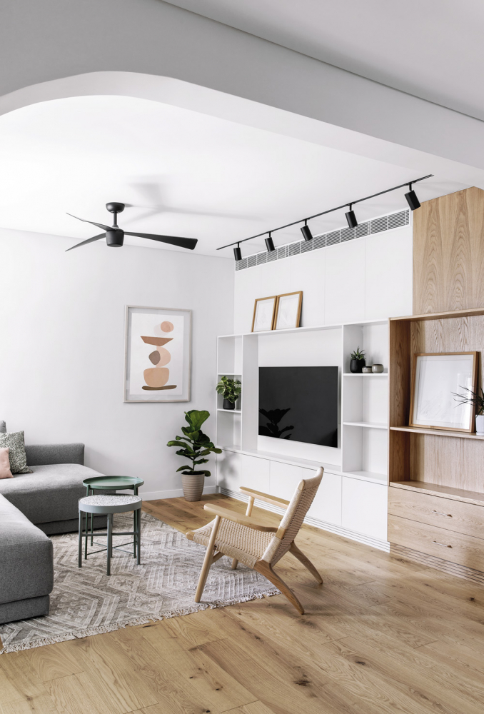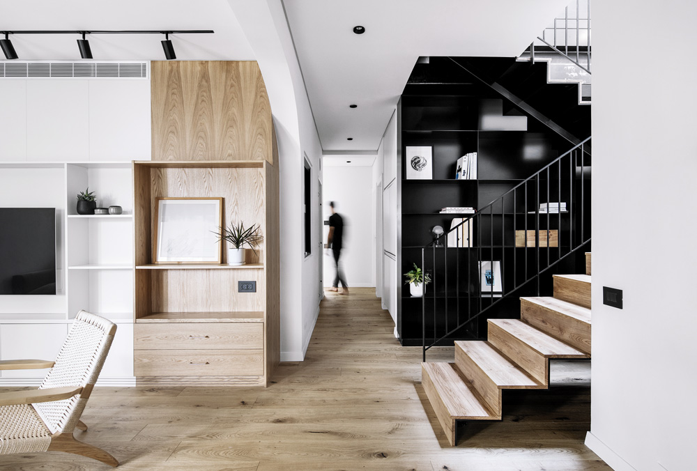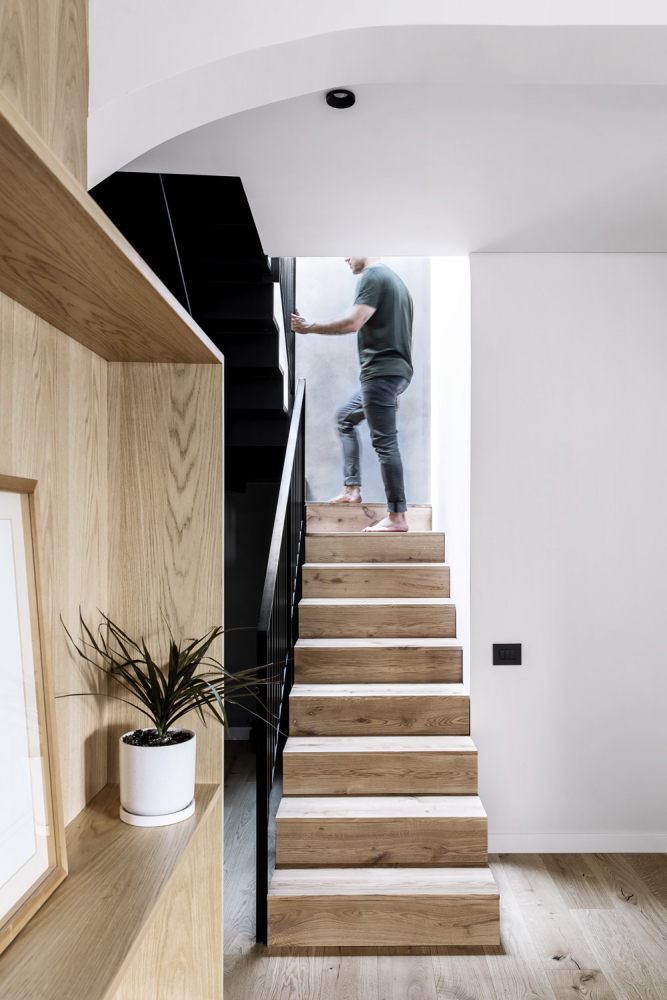 Za využití rafinovaných dřevěných i železných detailů architekti ze studia RUST Architects vytvořili puristický prostor maximálně přátelský k rodinnému životu. Díky množství na první pohled skrytých vestavěných úložných prostor nic nenarušuje rodinný provoz a s využitím jednoduchých ploch a čistých linií zůstává interiér vždy vzdušný a maximálně praktický.