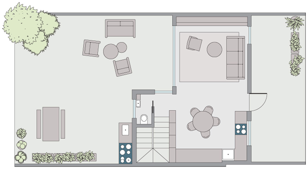 Jeho dominantní součástí jsou dřevěné schody orámované řemeslně zpracovaným železným zábradlím, na které díky střešnímu oknu dopadá dostatek přirozeného světla. Nepřehlédnutelné schodiště vede rovnou do přístavby nenápadně formující veřejný prostor domu – zahrnuje rozměrný obývací pokoj s plně vybavenou kuchyní, jídelní zónou i sociálním zázemím.