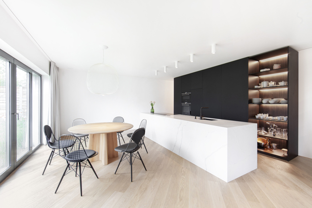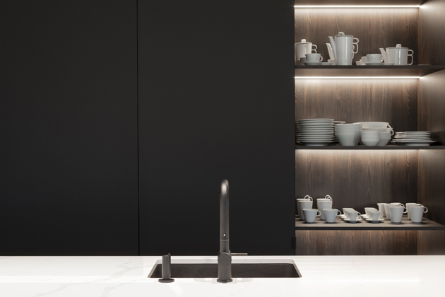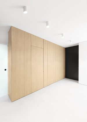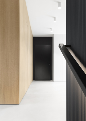 Foto: Kristina Hrabětová pro M&TVelké plochy uvedených materiálů pak autoři doplnili zařizovacími prvky v kontextu pojetí celého interiéru tak, aby na sebe zbytečně nestrhávaly pozornost. A i proto zvolili kliky MINIMAL z dílny rodinné manufaktury M&T ve dvojím barevném provedení. „Při výběru klik do celého domu jsme jednoznačně vsadili na mimikry – přáli jsme si takové, které přirozeně splynou s povrchem dveří. A jelikož v interiéru střídáme tmavé a světlé dveře, potřebovali jsme na to reagovat,“ líčí designéři. Na černé dveře tak zvolili kliky v matném černém titanovém povrchu, nicméně bílé v tu dobu nebyly k dispozici. „Bílý povrch pro kliky jsme už dlouho zvažovali, a když nás Roman Vrtiška a Vladimír Žák oslovili, zda by byla možnost vyrobit kliky MINIMAL v bílém provedení, rádi jsme jim vyšli vstříc,“ říká Roman Ulich z M&T.