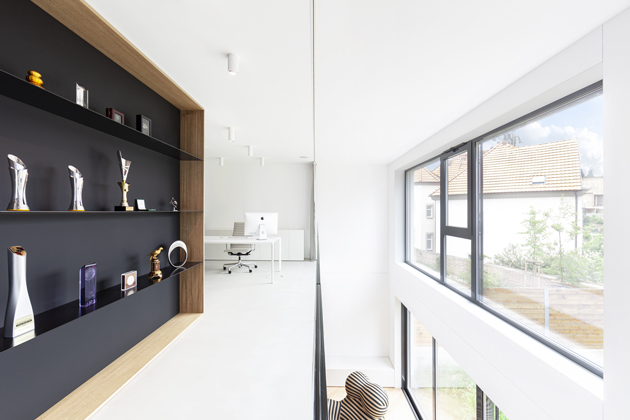 Dům se nachází ve svažitém terénu, do kterého je z jedné strany částečně zapuštěný. V prvním nadzemním podlaží, které je přístupné z ulice, se nachází garáž, uvítací hala a jedna ze dvou prostorných šaten. Na lobby následně navazuje pracovna, ve které autoři interiéru zásadním způsobem ovlivnili dispozice domu ubouráním části prvního nadzemního podlaží. „Chtěli jsme docílit efektu vzdušnosti a reprezentativních prostor, což nám stropy vysoké 2,8 metru neumožňovaly. Rozhodli jsme se proto vytvořit zde galerii,“ vysvětluje Roman Vrtiška. Vzniklá galerie tak propojila pracovnu a přilehlou „síň slávy“ s trofejemi ze sportovních soutěží s centrální obytnou místností, která se nachází o patro níže. Obyvatelé domu tak spolu mohou v případě potřeby komunikovat napříč místnostmi i patry, ale primárně jim zůstává zachované soukromí.