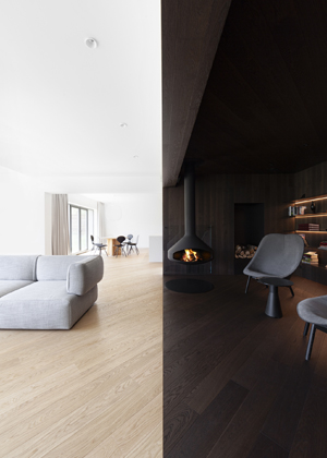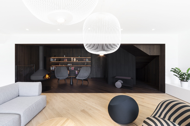 Do dalších prostorů domu vede schodiště v provedení tmavého odstínu dubové dýhy, a kromě něj jsou jednotlivá podlaží propojena také výtahem. V nejnižším podlaží, do kterého je otevřená galerie, se nachází velký centrální prostor sdružující obývací pokoj, kuchyni v černo bílém provedení a jídelnu. Dominantou obývacího pokoje je ikonické křeslo UP od italské firmy B&B Italia, které vhodně doplňují konferenční a odkládací stolek HRIB, které designérské duo Vrtiška & Žák navrhlo pro slovenského výrobce Javorina. Obývací část pak plynule přechází v odpočinkovou zónu s posezením u krbu, výklenek, který je nejvýraznějším příkladem důmyslné práce s tonalitami dřeva – celý je vyvedený v tmavém provedení a s černými doplňky.