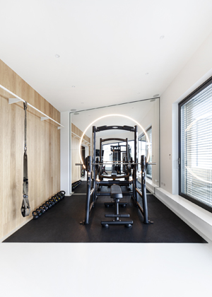 Nejvyšší a zároveň plochou nejmenší poschodí autoři původně zamýšleli jako ideální prostor pro ložnici. Patro totiž skýtá impozantní výhled přes řeku na celou Prahu, přes Stromovku až na Letnou. „Toto řešení se logicky nabízelo. Po společných diskuzích s majiteli se však ukázalo, že oni si zde ložnici nepřejí. Naopak vyjádřili přání zde vybudovat fitness prostor,“ vysvětluje Vladimír Žák. Celé patro je tak věnováno tréninkové aktivitě, součástí je také ledová lázeň, bar a koupelna. Posilovna pak plynule navazuje na venkovní terasu.
