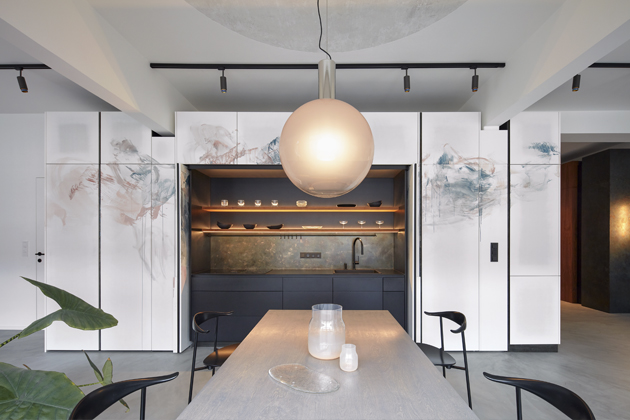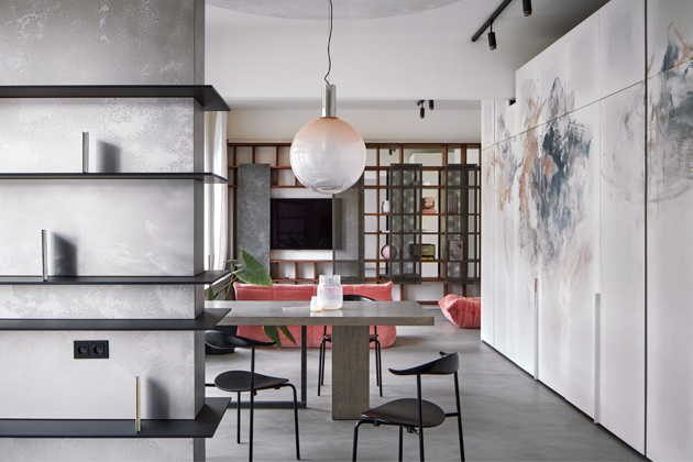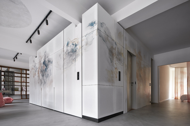 Do prostoru, který se díky úpravám otevřel, navrhla architektka velký atypický nábytkový blok prostupující celým bytem a pojímající vše potřebné. Hned u vstupu jsou v něm zasazeny dvě technické místnosti, jež následuje šatní skříň. Blok prostupuje dál do interiéru a skrývá úložné prostory, dvě menší koupelny, ale také malou, jednoduchou, křídly krytou kuchyni. Z pláště atypicky řešeného bloku se stalo velkoformátové plátno, které dokonale pojednala výtvarnice Klára Spišková. Její silná malba kontrastuje s podkladem ze surových MDF desek a dává celku jedinečnou energii. Zbytek bytu ponechala autorka jednoduchý a doplněný jen několika výtvarnými solitéry.