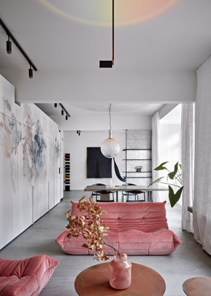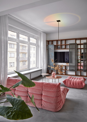 Skořápka bytu odráží prapůvodního ducha. V samotném základu zůstala střízlivá bílá, vyvolávající až galerijní atmosféru, prostorem proplouvá jen jemný narůžovělý nádech, který se postupně proměňuje a graduje na obou koncích bytu: v obýváku malinovým sofa a v ložnici se míchá s odstíny meruňkové a výrazné červánkové, které se objevují na závěsech od Lindy Kaplanové.