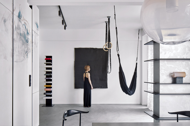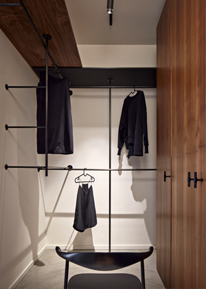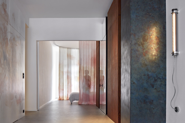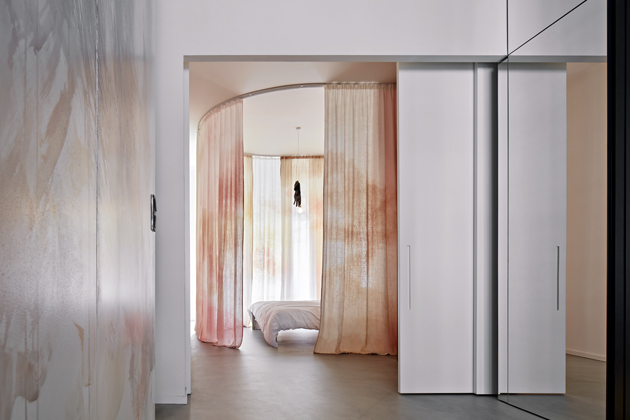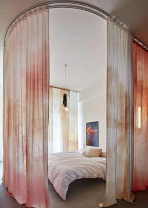 Lněné textilie dvou hrubostí obtékají měkkým obloukem postel, oddělují tak spací zónu a jemně zabarvují pronikající světlo. Něžnému výrazu ložnice sráží hrany svítidlo od Ingo Maurera a fotografie od Bet Orten. Křehké narůžovělé tóny jsou postaveny do kontrastu s kovy, které jsou použity ve velkých měřítcích.