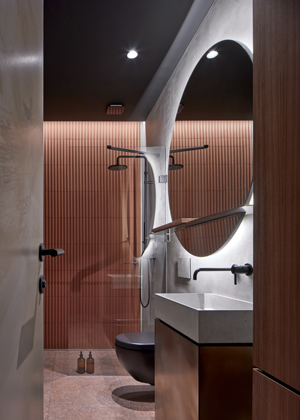 Barevný koncept se proměňuje také uvnitř a vně, pro vnitřek bloku jsou použity tmavší, uzemněnější odstíny. Červánkový barevný tón se v koupelnách proměnil do útulné tmavě cihlové až terakotové barvy, jejíž dojem hřejivosti umocnilo použití ambientního svícení.