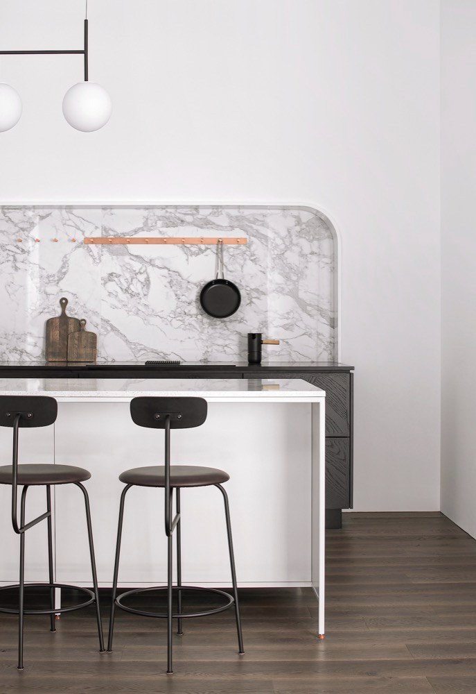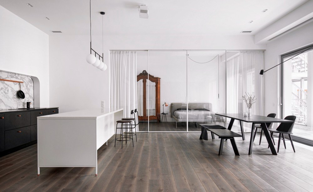 Autoři kladli velký důraz na to, aby se denní světlo dostalo skutečně téměř do všech koutů bytu. V zájmu této vize se jako zcela nepostradatelný pomocník projevily prosklené příčky, kterým skvěle sekunduje vybavení v duchu striktního severského minimalismu. Hlavní obytná místnost – obývací pokoj s kuchyní – tvoří centrální část bytu, kterou zalévá denní světlo vstupující dovnitř dvěma rozměrnými okny. Ke klasickým dvoukřídlým dveřím, které z obývacího pokoje vedou do ložnice pro hosty, přiléhá elegantní kovová knihovna v puristickém stylu, se kterou architekti neváhali překrýt téměř celou stěnu. Hned vedle ní jsou umístěny sivá polstrovaná křesílka s nízkým kovovým stolkem v industriálním designu a masivní černý jídelní stůl s židlemi a lavicí. Přilehlá kuchyňská část drží designovou linii se zbytkem interiéru – kromě minimalistických tvarů sází na barevný kontrast bílé a černé, vyšperkovaný detaily z mramoru a leštěné mědi.