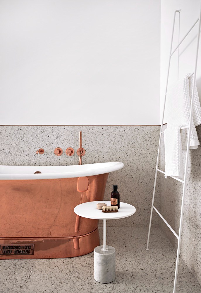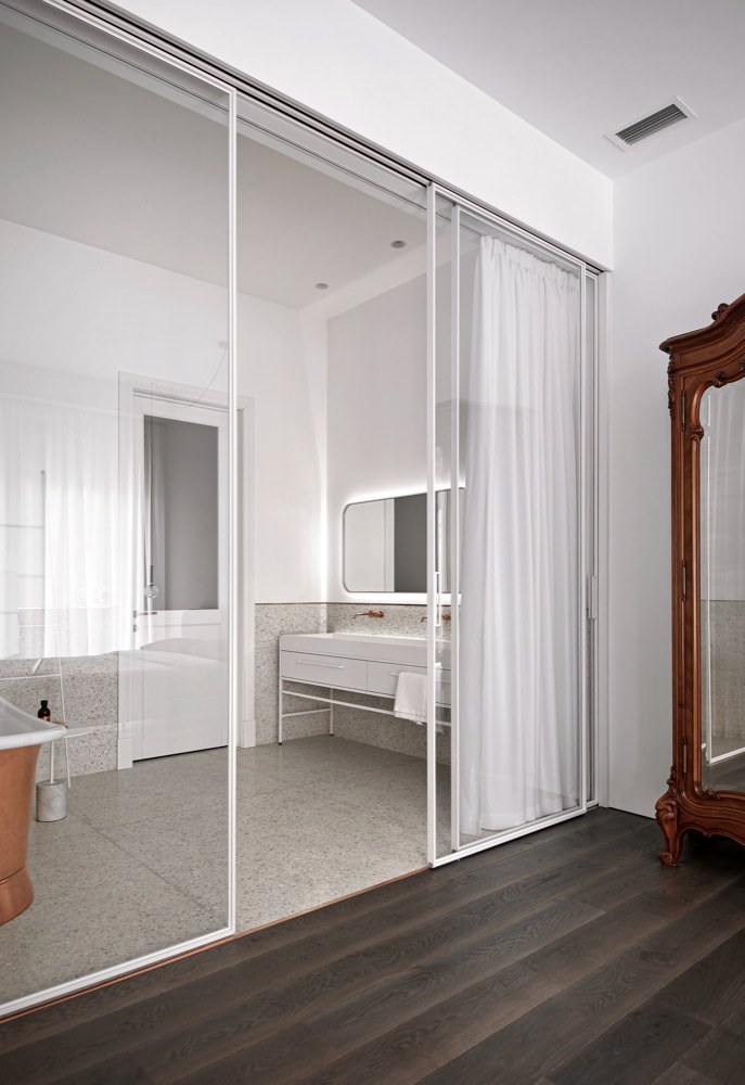 Hlavní ložnice majitelů je od obývacího pokoje oddělena jen lehkou prosklenou příčkou, která umožňuje prostor fakticky rozdělit a neubírá mu nic z jeho vzdušnosti. Jejím úskalím je však soukromí. I na to ale autoři rekonstrukce mysleli a společně s příčkou nechali nainstalovat i lehký bílý závěs, který jakékoli nežádoucí pohledy hravě odstíní. Dominantou hlavní ložnice není ani tak tvarově velmi prostá čalouněná postel, jako spíše starožitná francouzská šatní skříň z tmavého dřeva s pozoruhodnou kresbou. Svým klasickým zdobným stylem se zbytku interiéru zcela vymyká, a působí tak jako zcela nepřehlédnutelný solitérní prvek. Hned vedle ní pak na odpočinkový prostor majitelů zcela nepozorovaně, také prostřednictvím skleněné příčky, navazuje asketicky bílá hlavní koupelna. Její prostor vizuálně zcela ovládá nepřehlédnutelná měděná vana, která si dobře rozumí s dalším minimalistickým vybavením – elegantním koupelnovým žebříkem, rozměrným umyvadlem s puristicky čistou skříňkou na kovových nohách i obkladem ze světlého terrazza.
