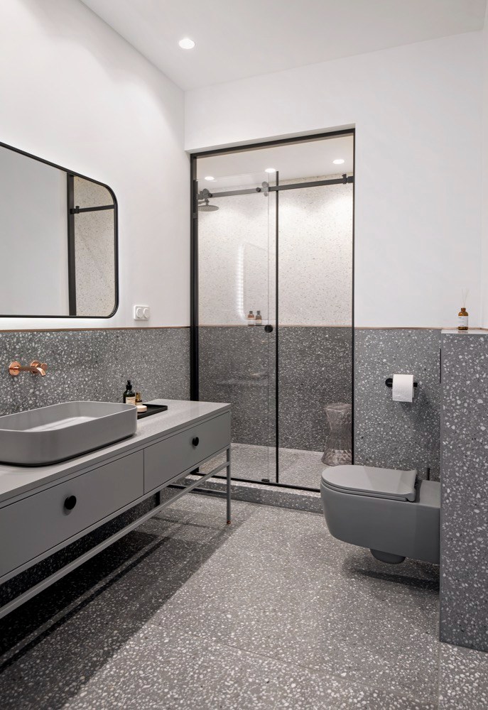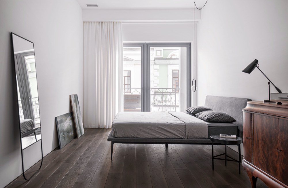 Z druhé strany k obývacímu pokoji přiléhá ložnice pro hosty – ta je však pro dosažení vyššího soukromí hostů oddělena zděnou stěnou. Díky dalšímu rozměrnému oknu je však i v jejím případě o dostatek světla postaráno. Minimalistické vybavení s čalouněnou postelí i v této části bytu dostává neotřelý šmrnc s elegantní starožitnou komodou z masivního dřeva. Nechybí ani vlastní koupelna vyhrazená speciálně pro hosty. Ačkoli s tou hlavní sdílí designovou linii, autoři se rozhodli ji odlišit obklady a koupelnovým zařízením v temnějších odstínech šedé.