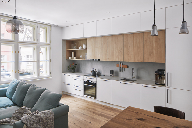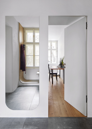 V rámci uspořádání prostor architektonické studio přemýšlelo nejen tak, aby jednotlivé místnosti byly dostatečně velké, ale také aby dávaly smysl pro každodenní život. Dispozici bytu tak dominuje hlavní obytný prostor s velkoryse pojednanou kuchyní, který má přímý vizuální kontakt s uličním prostranstvím. Do klidného vnitrobloku je pro změnu umístěna ložnice, protější místnost je pak koncipována jako pracovna nebo do budoucna dětský pokoj.