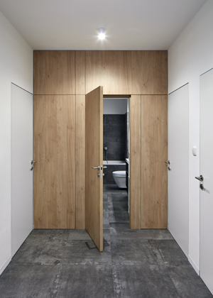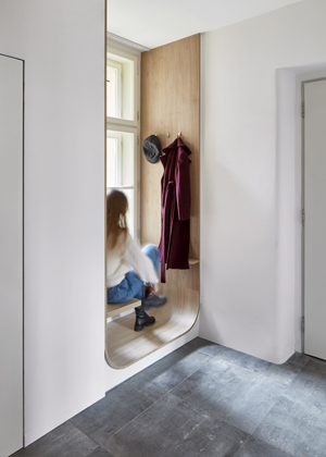 Zajímavým prvkem odkazujícím k původním činžovním domům, kterým dominovala pospolitost, je fakt, že všechny prostory jsou propojeny otevřenou centrální halou, která za truhlářskou stěnou skrývá koupelnu. Výsledkem je neotřelý interiér pro majitele užívající si všechny aspekty městského života.