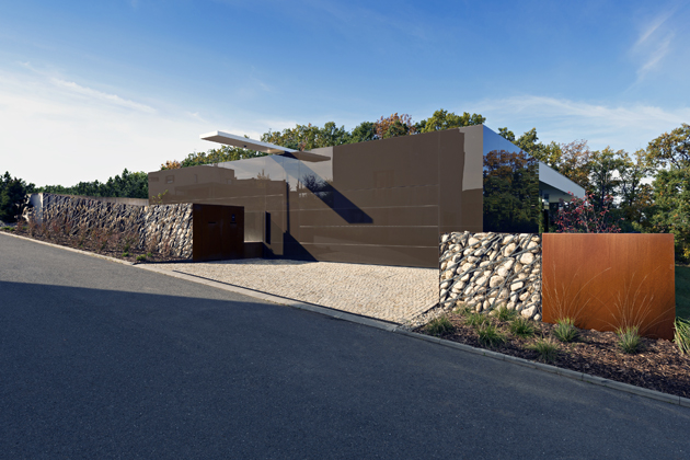 Směrem do ulice drží dům pevnou linii, sem jsou orientovány pomocné místnosti a garáž. Působí dojmem uzavřenosti, avšak nehmotně, neboť velká plocha hnědě tónované skleněné fasády odráží okolní prostředí a nebe.