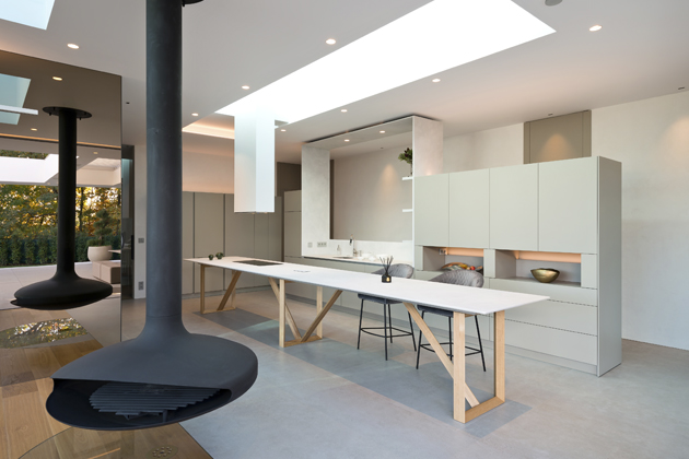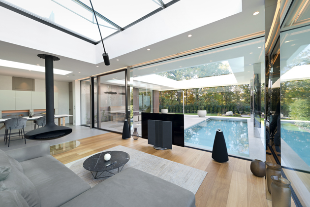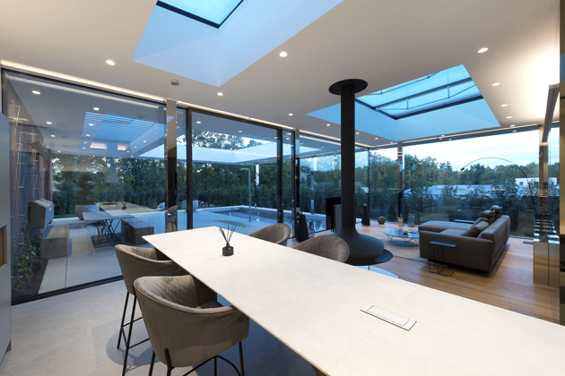 Obývací část je opatřena skleněnou střechou vybavenou zasouvacím stíněním. Stejně tak je prosklenou střechou přisvětlená i kuchyň nad pět a půl metru dlouhým stolem.