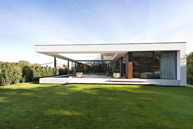 Zde je umístěn na zakázku vyrobený nerezový bazén i vířivka, sprcha a také venkovní jídelna a bonsaje. Jídelnu kryje bioklimatická pergola. Bílé trámy atria odrážejí světlo zpět do místnosti, a rafinovaně tím napomáhají prosvětlení. K domu přináleží také sauna a zahradní domek.