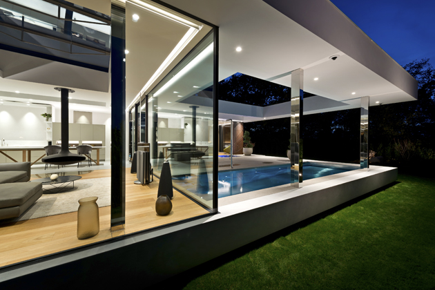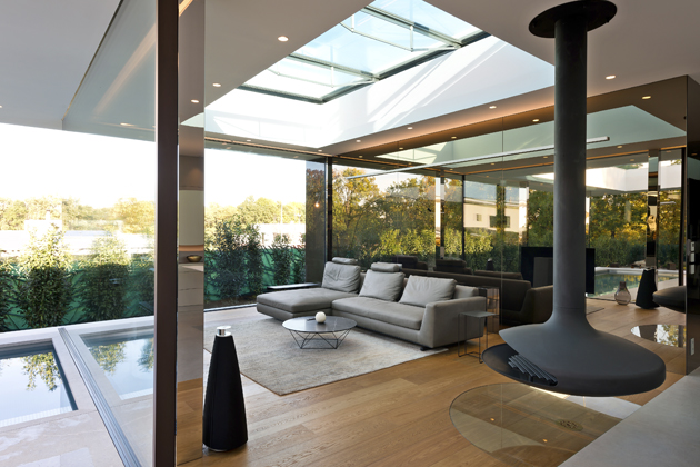 Na vstupní zádveří navazuje uzavíratelná šatna. Srdce domu tvoří volně otevřený společenský prostor s kuchyní, jídelnou a obývacím pokojem se zavěšeným krbem, k němuž za prosklenou stěnou přiléhá relaxační prostor s bazénem a venkovní jídelnou a z druhé strany, za bronzovým zrcadlovým obkladem, dvougaráž.