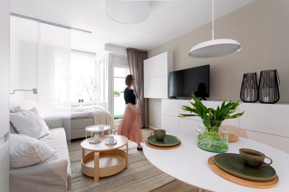 Majitelka požadovala celkovou úpravu, kdy bylo třeba zasáhnout do elektrických i vodovodních rozvodů. Očekávala novou podlahu, kuchyň, pohovku, ideálně dvojlůžko a štědré úložné prostory. Odvážným záměrem tedy bylo vytvořit kompletně nový vzdušný prostor z jedné místnosti – polyfunkční prostor se všemi zónami – kuchyní, jídelnou, obývacím prostorem s rozkládací pohovkou na trvalé spaní, ale i s úložnými prostory a také s umístěním dvou pelíšků pro malé psy. Úložné prostory byly i zde nezbytné. V předsíni je sice velká skříň, ale nestačí. Byt navíc nemá ani sklepní kóji.
