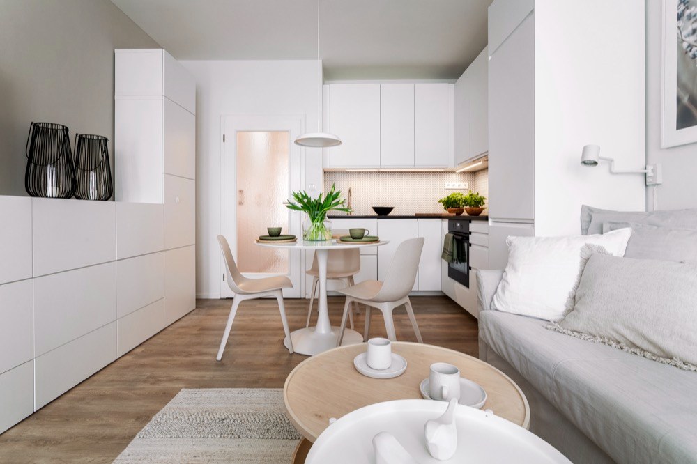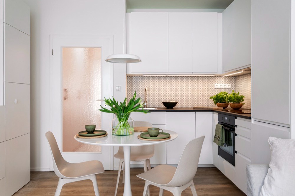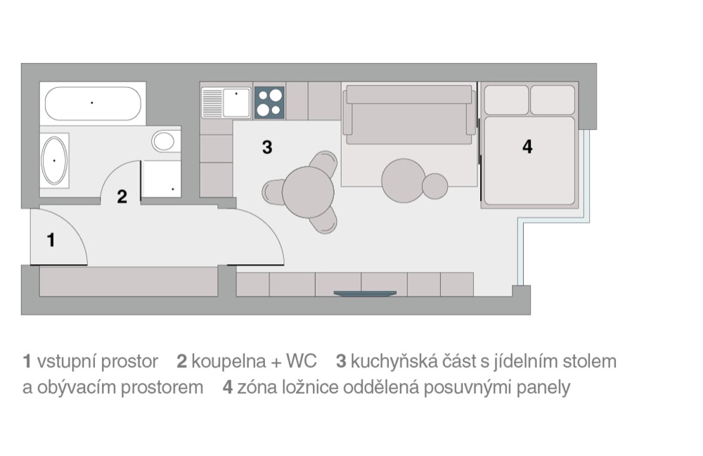 Zbroušením několika milimetrů zdi a výměnou prahů se nakonec podařilo do výklenku umístit i dvoulůžko. Také spíž je vetknutá do obývacího prostoru vedle dveří, ale v designové úpravě nábytku obývacího prostoru, ne kuchyně. Pro optické zvětšení a prosvětlení prostoru volila designérka nejen bílý nábytek, ale i krytinu z lepeného vinylu v bělené variantě simulované dřeviny.