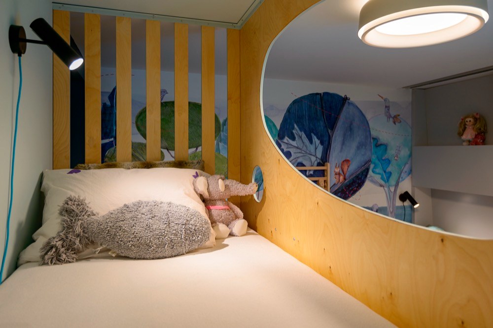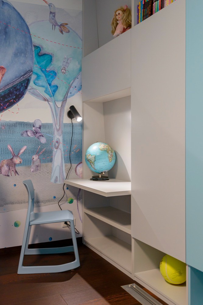 Ráda utíkám do lesa. Vyčistit si hlavu. Nadechnout se. Na chvíli zapomenout na termín uzávěrky. Miluju jeho vůni, cvrlikání ptáků, tichý šum, a hlavně ten božský klid. A když se mi podaří zahlédnout veverku, mám stejnou radost jako můj pětiletý syn Mikuláš. Stejně tak se s oblibou nořím do bezstarostných vzpomínek na dětství. Což jsou nejspíš i důvody, proč ve mně tento dětský pokoj s úžasnými malovanými tapetami s motivem lesa vyvolává příjemnou euforii. Markéta se netají tím, že právě tapety využívá ke korigování prostoru – opticky ho může zvětšit, odpoutat pozornost třeba od ne úplně vhodně zvolené podlahy nebo díky vhodně zvolené tapetě dodat místnosti více světla. Děti milují bunkry, ví to i designérka, proto navrhla úžasnou postel ve stylu bunk bed, která nápadně připomíná posed, čímž se jí dokonale podařilo naplnit nosnou myšlenku celého pokoje. Překvapilo mě i to, jak si poradila s nikou, před kterou se posouvá křídlo okna. Umístila do ní knihovnou s částečně uzavřenými a otevřenými skříňkami, přičemž do místa, kam nedosáhne posuv okna, integrovala malý pracovní stolek s LED podsvícením, který lze do budoucna doplnit rohovým dílem v místě, kde nyní stojí průlezka. Oceňuji, že při výběru herních prvků zvolila českého výrobce, který při celém výrobním procesu dbá na životní prostředí, používá pouze přírodní materiály, snaží se dřevo zpracovat do posledního kousku, a navíc za každý vytěžený strom vysadí tři stromy nové.
