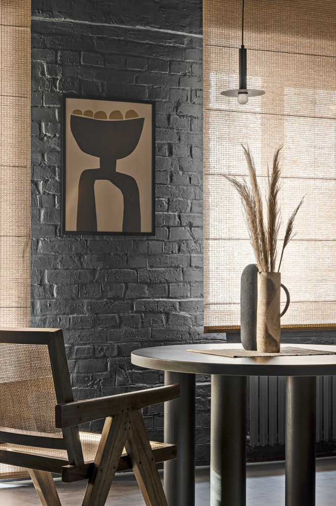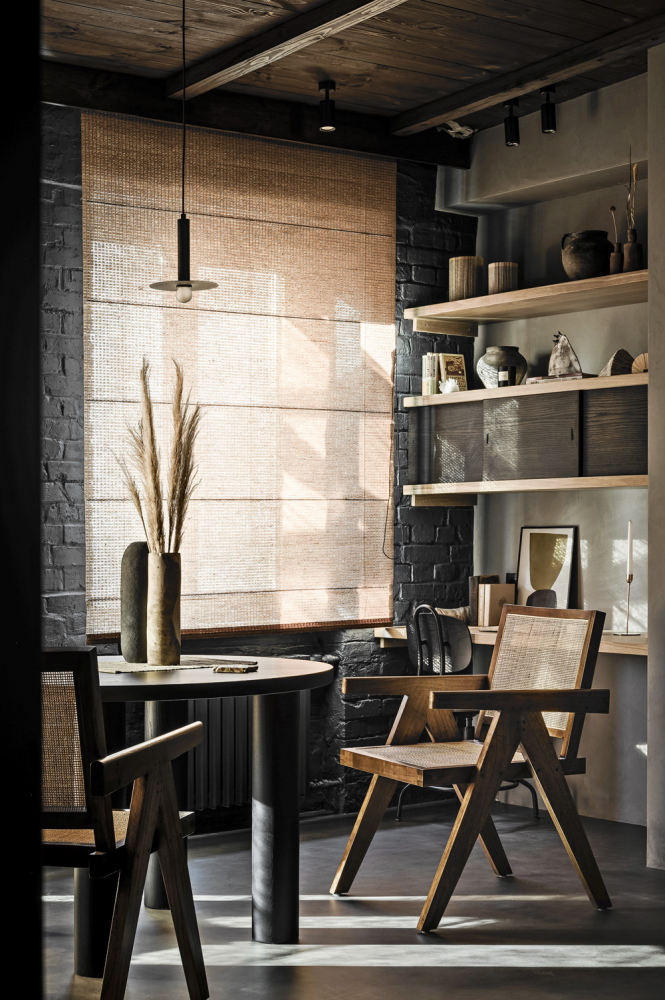 Autorský dřevěný čajový stolek, masivní židle s ratanovým výpletem, výrazné dřevěné police, bambusové rolety i hrubý přírodní koberec mají na téměř černé kulise příležitost skutečně vyznít. Olga Fradina s oblibou vytváří nadčasové kombinace zdánlivě neslučitelných stylů. V tomto případě vsadila na neotřelou kombinaci etnostylu s modernismem protkanou detaily s orientální atmosférou.