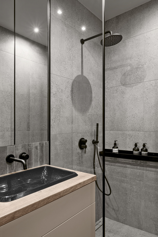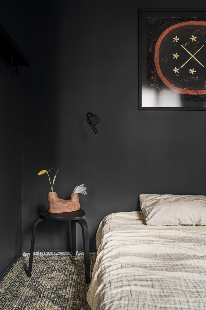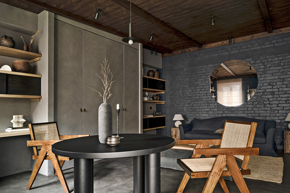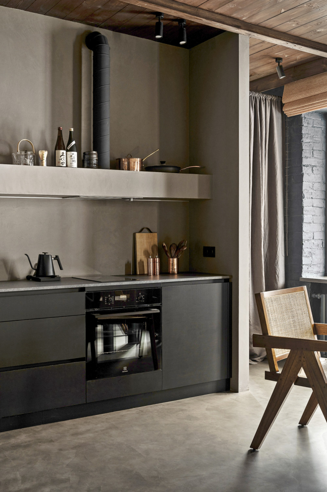 Společně s vhodně zvolenými tvary a materiály však byt nepůsobí nijak stísněně. Díky tmavým stěnám i stropu vypadá až nečekaně prostorně. Povrch podlahy tvoří hladký mikrocement, který společně se stěnami a dvířky úložných prostor i kuchyňské linky tvoří efektní pozadí pro použitý nábytek a dekorace s výraznou texturou.