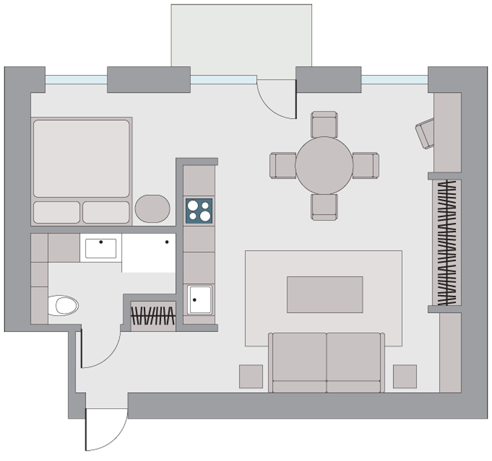 Základním krokem bylo přemístění stěny, která původně oddělovala koupelnu od vstupní chodby a obývacího pokoje. Díky tomu došlo k rozšíření koupelny, což umožnilo instalaci sprchového koutu plnohodnotné velikosti. Větší prostor tím vzniknul i ve vstupní chodbě a nebyl tak nejmenší problém ani s umístěním potřebných skladovacích systémů.