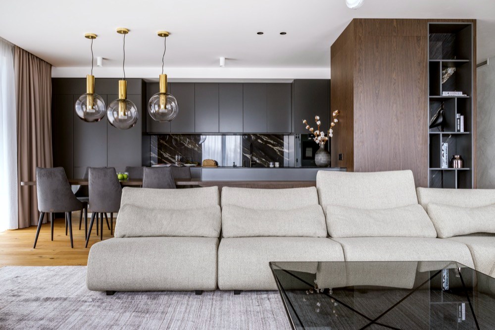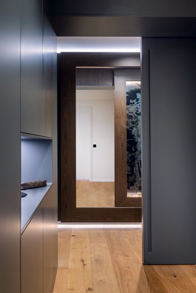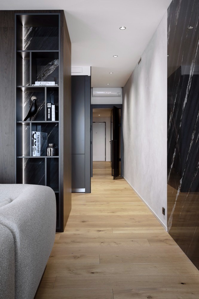 Studio se během realizace muselo vypořádat nejen s nevhodně umístěnou rekuperační jednotkou, která zabírá celou prostřední část skříně na chodbě, ale také s chytrou elektroinstalací, která v tomto vyšším standardu bytu byla už v základu. „Její rozšíření a adaptace na nový interiér byly nákladnou a v několika ohledech i limitující částí přestavby. Limit v obývací části tvoří jádro, které prochází prostorem vedle kuchyňského ostrova a do jisté míry definuje možnosti uspořádání prostoru. To jsme obložili dýhovanými deskami a doplnili ho na stranách o decentní knihovny tak, aby měl tento prvek v interiéru i své praktické využití,“ vysvětluje Matěj Mlch.