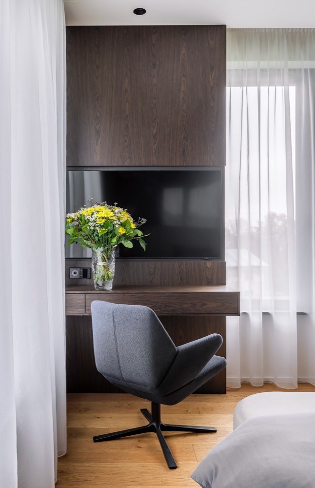 Skvělými vychytávkami je kvalitní a atraktivní interiér obdařen hojně. Skrývá například dveře do hlavní ložnice, která sousedí s obývacím pokojem. Typové dveře byly nahrazeny dveřmi zakomponovanými v předsazeném dýhovaném obkladu, jenž po obvodu osvětluje keramiku. Prvek je přínosný pro větší soukromí ložnice, ale i pro obývací část, kterou stěna definuje. Praktické řešení nabídlo i nahrazení standardních dveří vedoucích z chodby do obývacího prostoru za atypické skleněné dveře, které umožňují otevírání oběma směry, propouštějí do hluboké chodby světlo a zároveň svým designem celek nijak nenarušují.