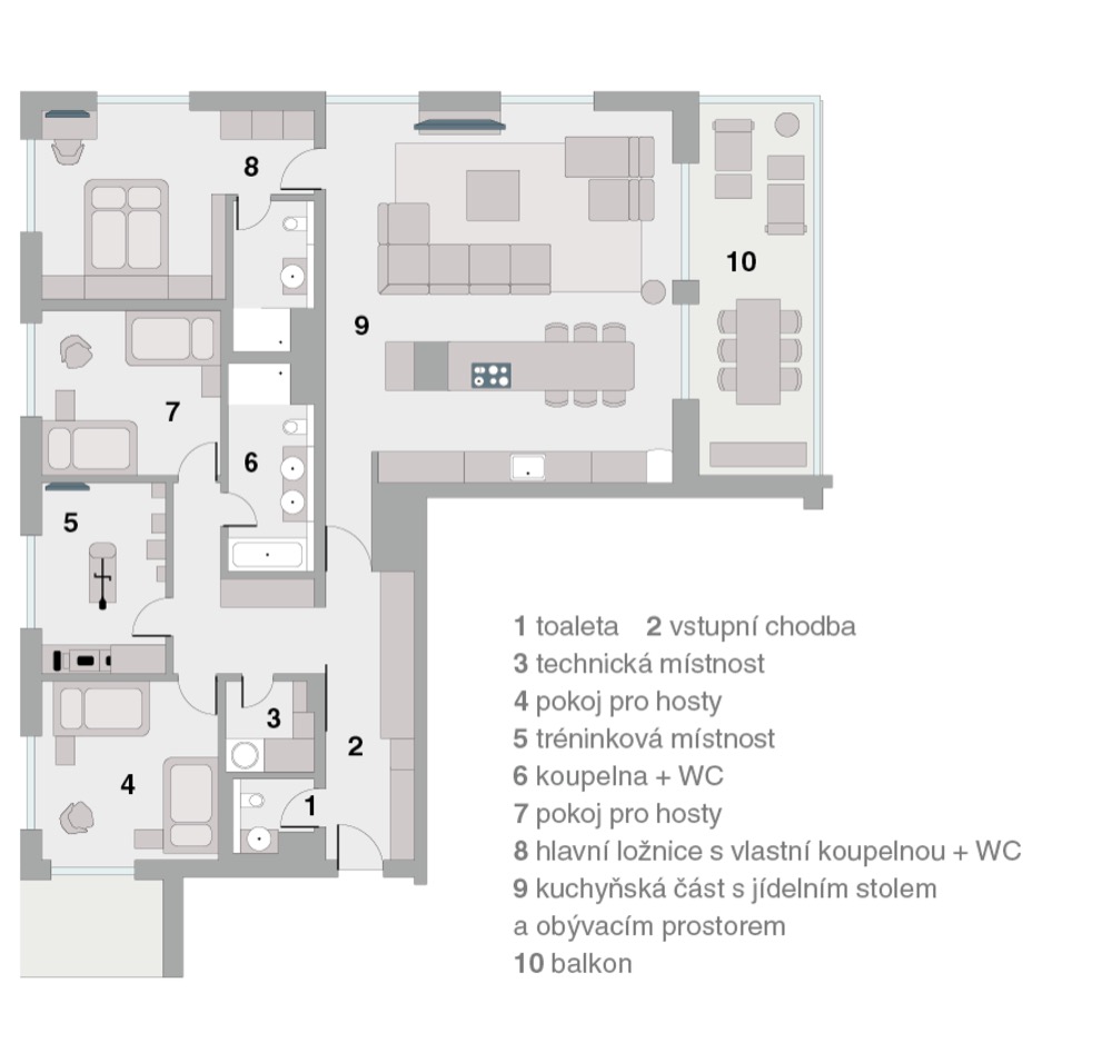Jedním z požadavků bylo vytvoření zázemí až pro čtyři hosty, kteří mohou v bytě krátkodobě pobývat. Specifický požadavek se týkal čtyř samostatných lůžek ve dvou pokojích určených hostům. Majitel si také přál upřednostnit obývací část před jídelní a také sedací soupravu, která by umožnila pohodlné usazení více osob. Protože je majitel vášnivým baristou s profesionálním vybavením, bylo třeba v rámci kuchyně upravit prostor tak, aby nenarušil čistý design celé kuchyňské části. Vybavení pro kávovar, mlýnek i oplach nádobí je proto umístěno v kapsové skříni v levé části kuchyně. Jako sportovec a cyklista, který se věnuje sportu velmi intenzivně, potřeboval majitel také konkrétně upravenou tréninkovou místnost.