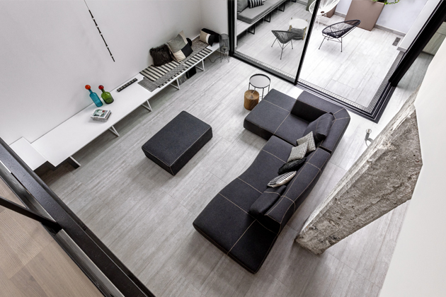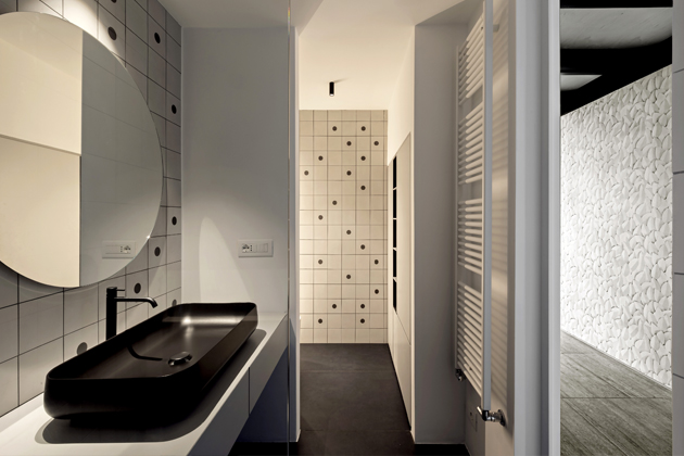 Bohaté prosklení eliminovalo problém tmavých zákoutí loftů v průmyslových objektech, která mohou být výsledkem atypické hloubky prostoru a velké vzdálenosti od oken. Šťastně zafungovala i barevná kompozice postavená na kontrastu mezi bílými stěnami, světlými podlahami z keramických dlaždic od Casalgrande Padana, černě lakované oceli a doplňků. Aby výsledek nepůsobil chladně, zakomponovala Paola Marè prvky z březového dřeva.
