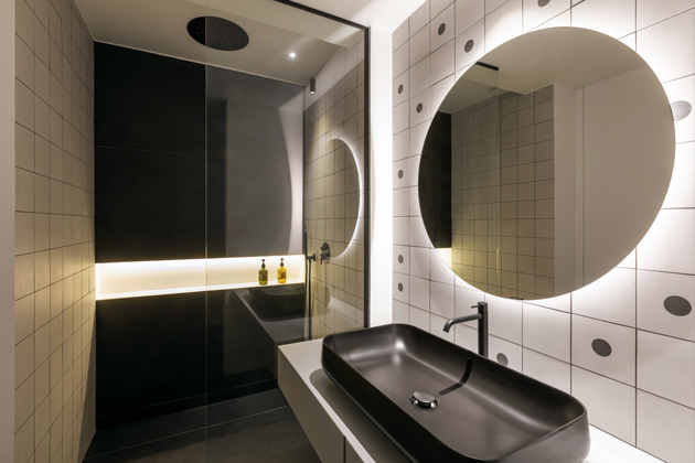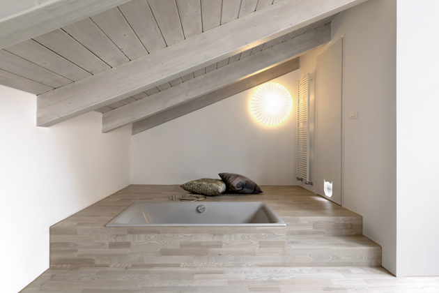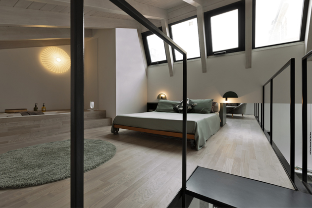 Všechna tři mezipatra tvoří klidovou část bytu, do níž je soustředěna ložnice se zapuštěnou vanou a malou koupelnou a relaxační zóna využívaná jako příležitostné zázemí pro hosty.Stejně jako zbytek interiéru jsou zařízena minimalisticky a velmi účelně. Díky dvojímu okennímu pásu je i tento prostor příjemně světlý. A jako v celém bytě si i zde designérka pohrála se svítidly, která byla vybrána vždy s ohledem na funkci a atmosféru dané zóny.