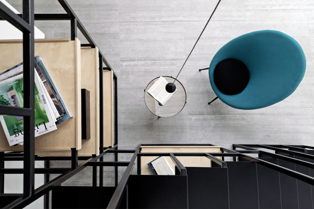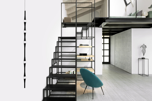 Samotné zařízení interiéru opřela o atypicky vyrobený nábytek včetně kuchyňské linky nebo šatny a prvky, mezi nimiž zaujímají výsostnou pozici na míru zhotovená schodiště v odlišných formálních a barevných provedeních. Dokonalá strategie, jak se vyhnout symetrizaci a bezvýraznému vyznění prostoru! Vsadila na několik designových solitérů od ikonických italských výrobců, jako je Zanotta nebo B&B Italia, a nebála se sáhnout ani po low-cost efektních doplňcích, jako je kompozice z papírových lampiónových svítidel v jídelní části.