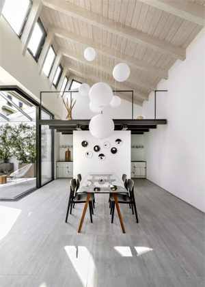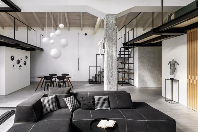 Základem loftu je multifunkční prostor plnící funkci kuchyně, jídelny, obývacího pokoje a pracovny. Jakkoli jde o prostor s otevřeným plánem, nepostrádá díky vloženým mezipatrům na členitosti, která přehledně zdůrazňuje funkce jednotlivých zón. Designérka ve svém návrhu zohlednila potřebu soukromí. Ta se promítla v použití posuvné stěny z dřevěných lamel, jež diskrétně odděluje pracovní prostor, nebo v částečném odstínění kuchyňské zóny za zděnou příčkou.